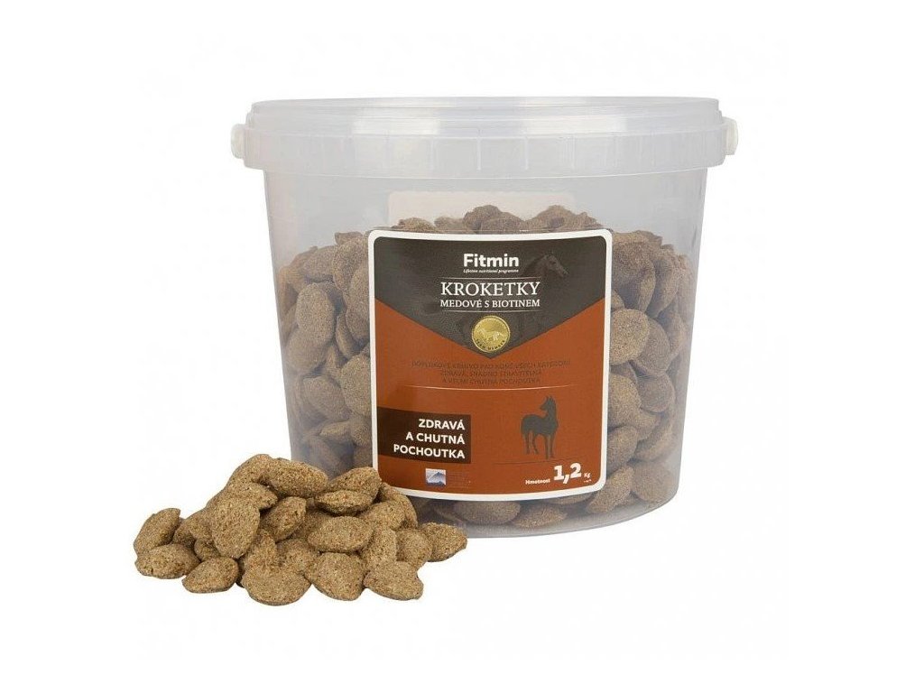 Fitmin krokety s medem a biotinem jsou doplňkové krmivo pro koně, které spojuje výbornou chuť s praktickým přínosem pro zdraví. Díky obsahu medu mají pamlsky přirozeně nasládlou chuť, kterou koně milují, zatímco biotin (vitamin B7) podporuje pevnost kopyt, lesklou srst a zdravou kůži. Tvrdší konzistence pamlsků přispívá k mechanickému čištění zubů při žvýkání. Jsou bez umělých barviv a konzervantů, vhodné pro každodenní použití jako odměna během práce i odpočinku.