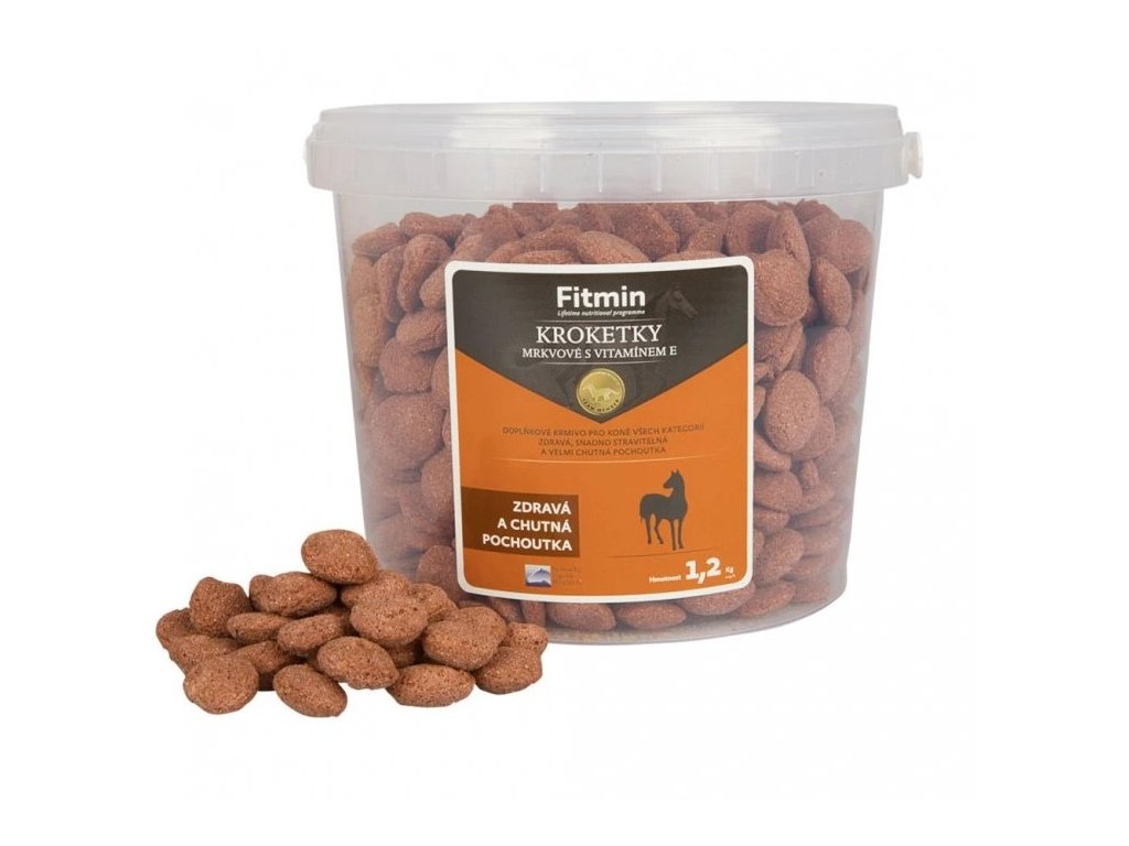 Pamlsky Fitmin krokety mrkev + vitamín E představují zdravou a chutnou odměnu, kterou si váš kůň zamiluje. Obsah sušené mrkve dodává pamlskům přirozenou sladkost a betakaroten, zatímco vitamín E působí jako antioxidant a přispívá k ochraně buněk, podpoře svalů a celkové imunitě. Krokety mají pevnou konzistenci, která pomáhá při žvýkání a mechanickém čištění zubů. Vhodné pro každodenní odměňování i jako doplněk ke krmné dávce. Neobsahují umělá barviva ani konzervanty.