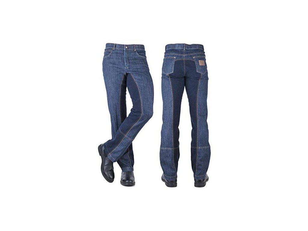 Funkční a vzhledové zajímavé pánské jezdecké kalhoty, s celokoženým sedem, prošívané po celé délce hnědou nití.