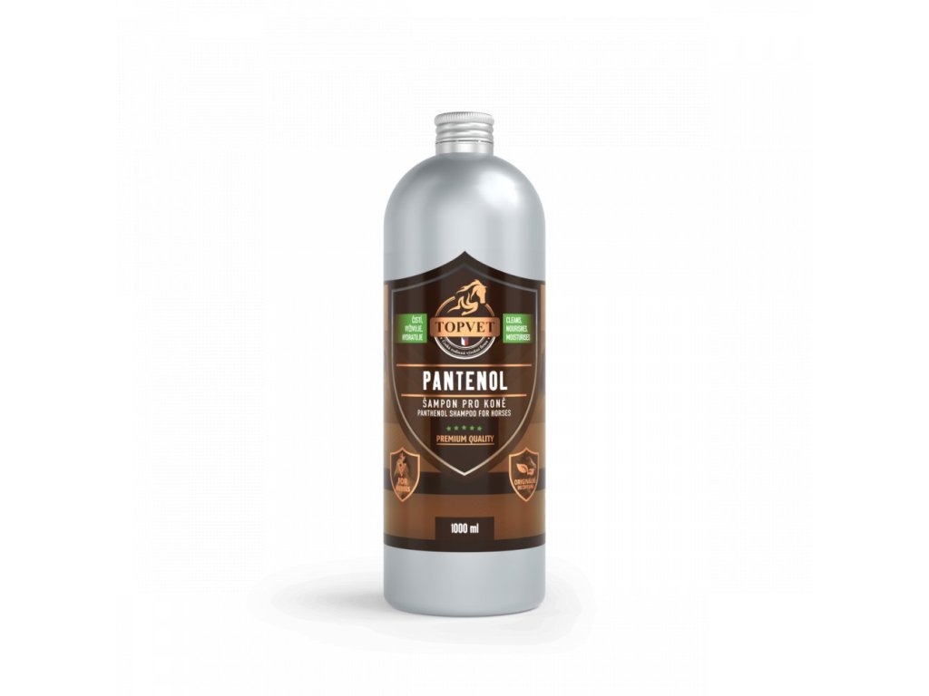 TOPVET Pantenol šampon 1000 ml je šetrný přírodní šampon vyvinutý speciálně pro koně. Díky obsahu pantenolu (provitamin B5) má výrazné hydratační, regenerační a zklidňující účinky. Jemně, ale důkladně odstraňuje nečistoty, pot a kožní maz, aniž by narušoval přirozený ochranný film kůže. Pokožku zklidňuje a napomáhá jejímu hojení, srsti dodává lesk, pružnost a zdravý vzhled. Šampon je vhodný i pro koně se suchou, citlivou nebo podrážděnou pokožkou, například po vyrážkách či při častém mytí. Neobsahuje parabeny ani silikony.