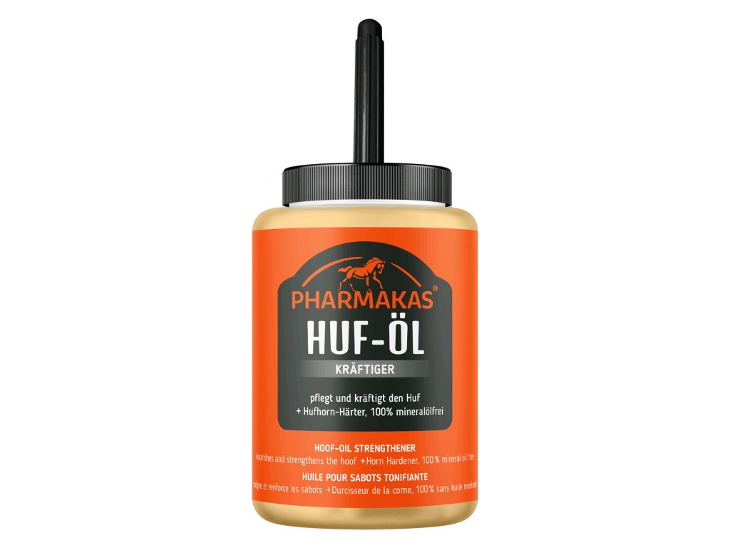 Pharmakas® Hoof Oil Stronger vyživuje kopyta komplexem přírodních olejů. Vysoce kvalitní složky posilují kopytní rohovinu a udržují přirozenou rovnováhu vlhkosti. Pharmakas® Hoof Oil Strengthener se rychle vstřebává, je 100% bez minerálních olejů a má příjemnou pomerančovou vůni. Ideální jako ošetření nebo pro každodenní péči. Aplikace je snadná a hygienicky čistá díky integrovanému kartáčku. Vhodný pro všechny typy kopyt.aplikace: Vhodný pro všechny typy kopyt: Použití: Aplikujte na kopytní roh a korunkový pás pro každodenní péči. Pro použití jako ošetření naneste na celé kopyto a jemně vmasírujte.Tip: Pro ideální podporu růstu kopyt doporučujeme Pharmakas® Biotin Forte Powder. varování před nebezpečím: