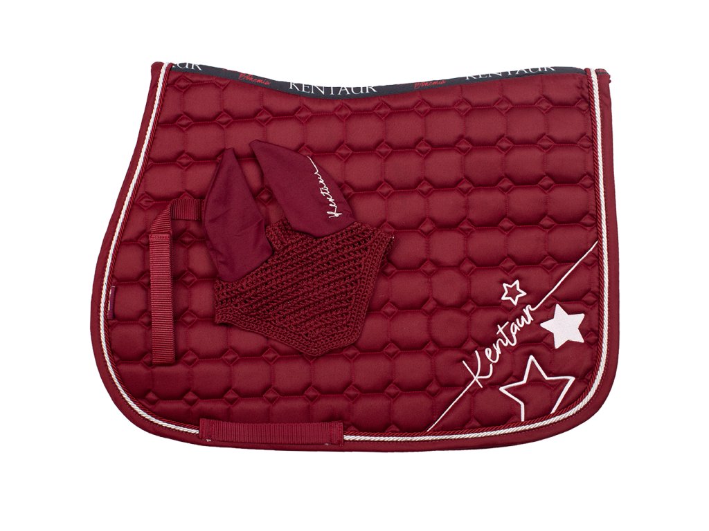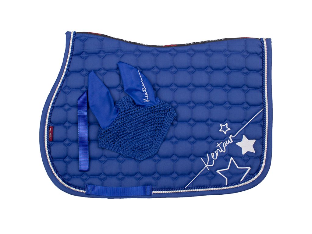 Tento pony set značky Kentaur obsahuje podsedlovou dečku a ladící náušníky s logem. Dečka má sportovní střih vhodný pro skokové disciplíny a je olemována dekorativní dvojitou kroucenou šňůrou. Spodní vrstva je vyrobena z funkčního hi-tech materiálu, který efektivně odvádí pot od těla koně a zajišťuje pohodlí během jízdy. Náušníky jsou pružné a vzdušné, navržené pro optimální přilnavost a vzhled.