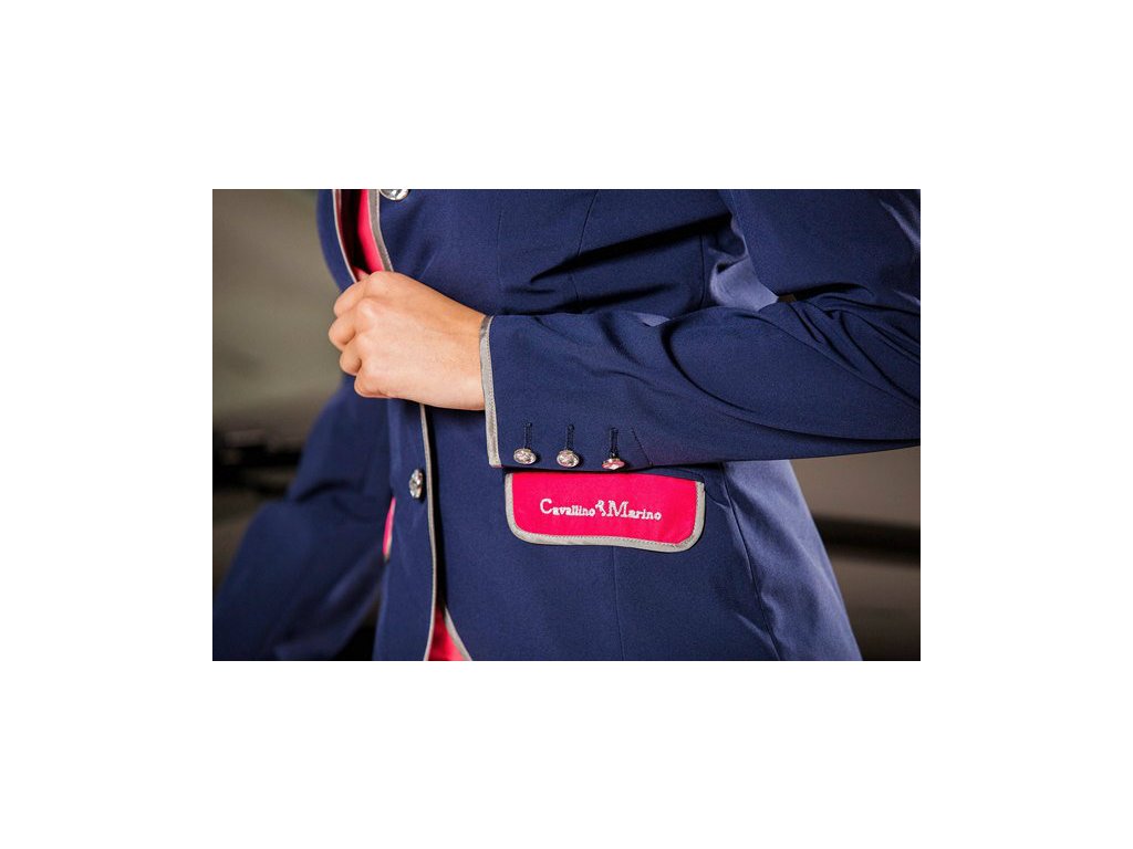 Závodní sako CAVALLINO MARINO kombinuje elegantní vzhled a funkční provedení ideální pro jezdectví. Je vyrobené z kvalitního softshellového materiálu, který je větruodolný, prodyšný a extrémně vodoodpudivý. Díky vypasovanému střihu dobře sedí a zároveň neomezuje v pohybu. Sako odpuzuje nečistoty, je nemačkavé a snadno se udržuje – lze jej prát v pračce i sušit v sušičce. Vhodné pro každodenní trénink i soutěžní využití.