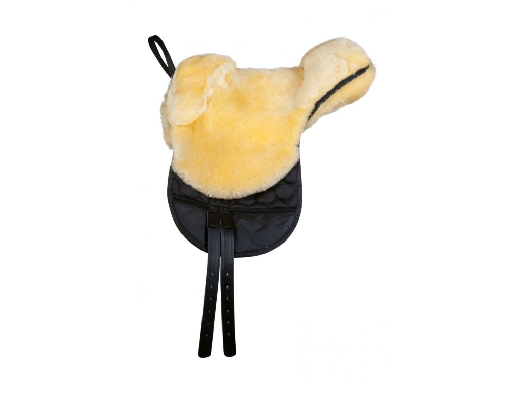 Pohodlný jezdecký pad značky HKM poskytuje výborný kontakt mezi jezdcem a koněm. Díky výrazným předním opěrkám a zadní rozsoše zajišťuje stabilitu a bezpečí při jízdě. Vrchní i spodní část je z pravého beránku, který je měkký a šetrný ke kůži koně. Vložka z vyměnitelné filcové podložky umožňuje použití i při delších vyjížďkách. Pad je vybaven 2D kroužky vpředu a 1D kroužkem vzadu pro připnutí třmenových řemenů, podocasníku nebo dalších doplňků. Celková délka je 60 cm, šířka 100 cm a délka posedlí 28 cm (vnitřní rozměr mezi zadní rozsochou a opěrkami).