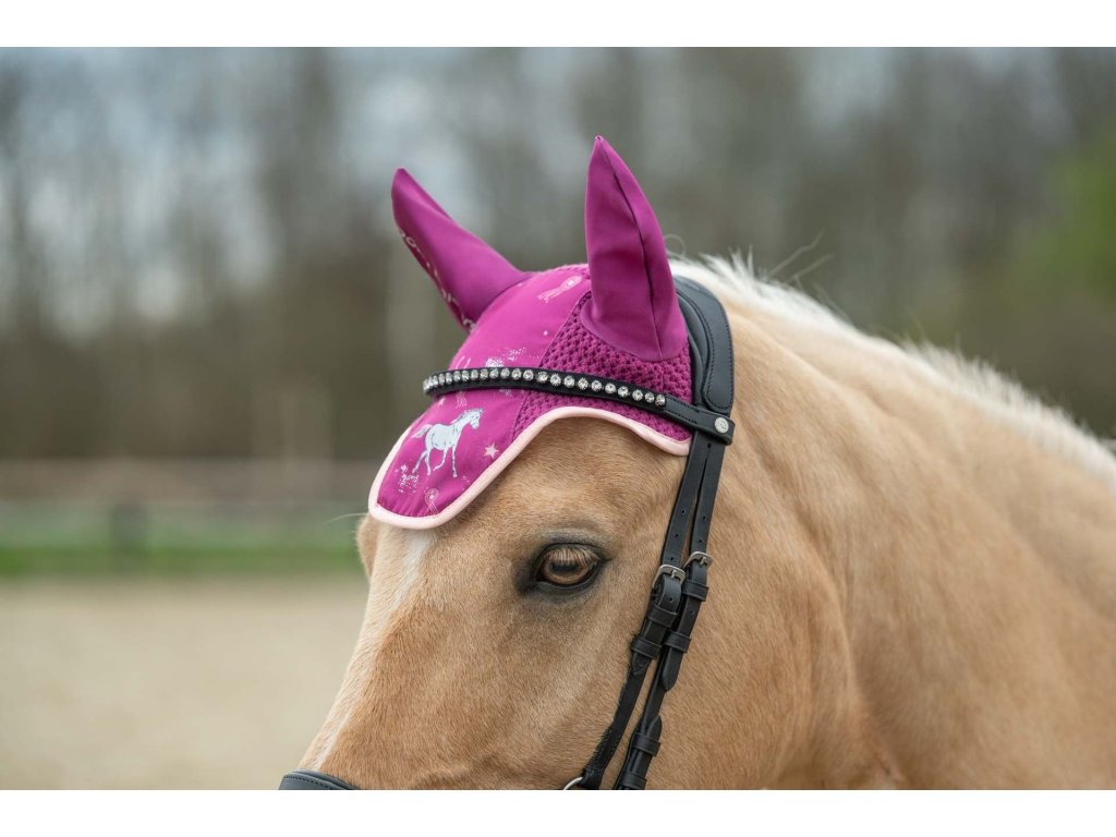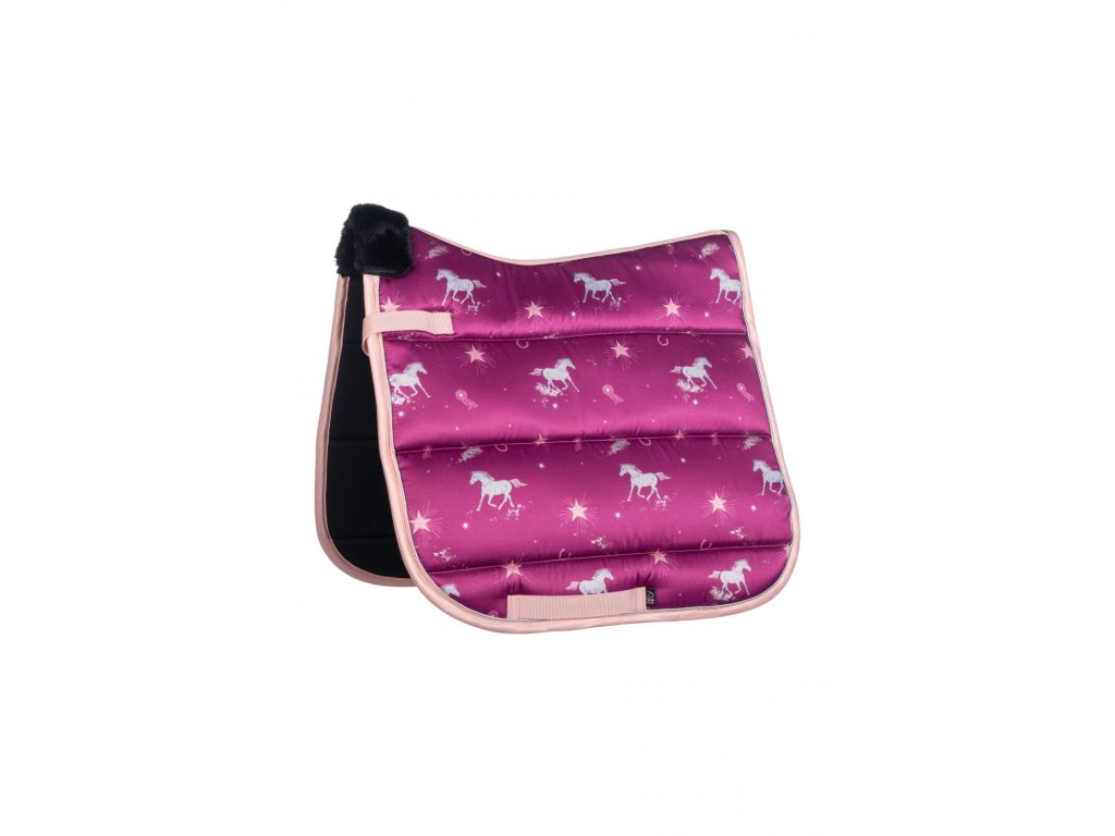 Set POLLY od značky HKM přináší kombinaci stylu a praktičnosti. Podsedlová dečka je anatomicky tvarovaná, zdobená výrazným potiskem a třpytivým efektem, což z ní dělá oblíbenou volbu pro mladé jezdce. Součástí je i ladící náušník. Spodní strana dečky je z funkčního materiálu, který pomáhá s odvodem vlhkosti a zajišťuje komfort při jízdě. Materiál ze 100% polyesteru se snadno udržuje a lze jej prát na 30 °C.