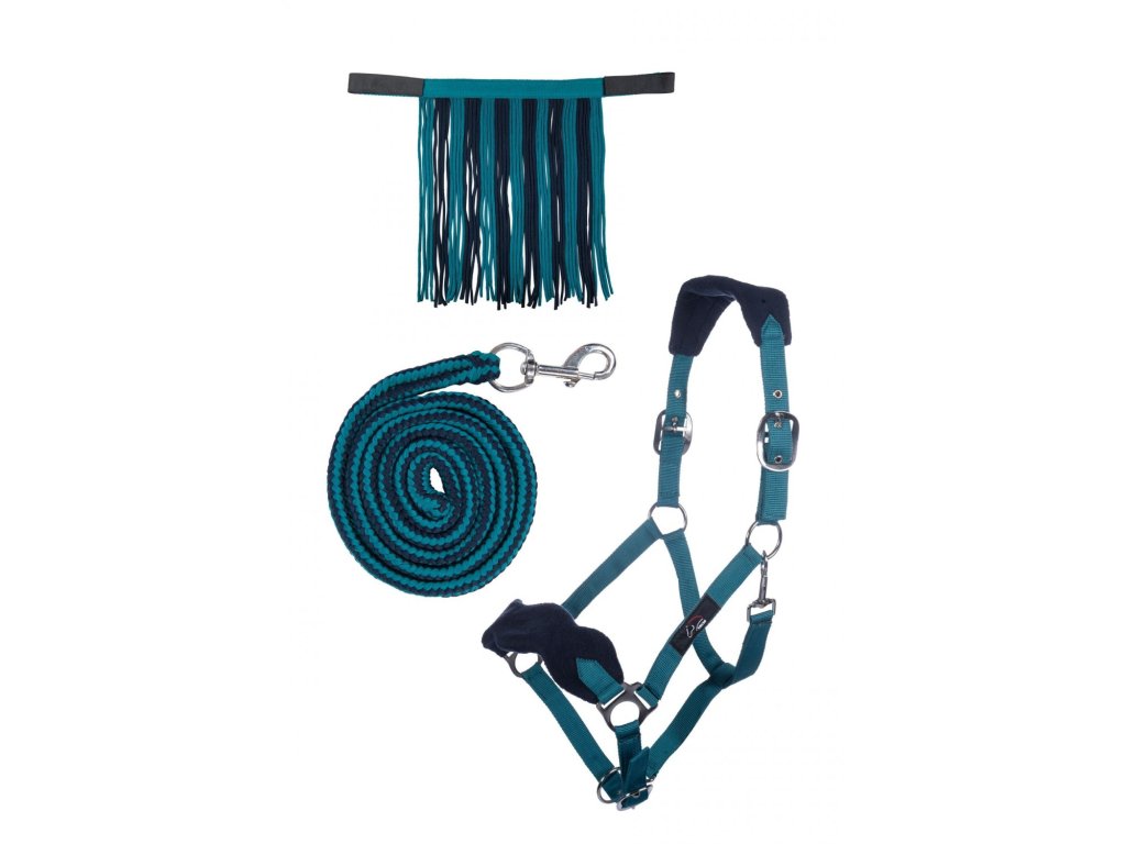 Set ohlávky s vodítkem a třásněmi. Ohlávka je v oblasti nánosníku a nátylníku měkce polstrovaná. Délka vodítka: 1,8 m