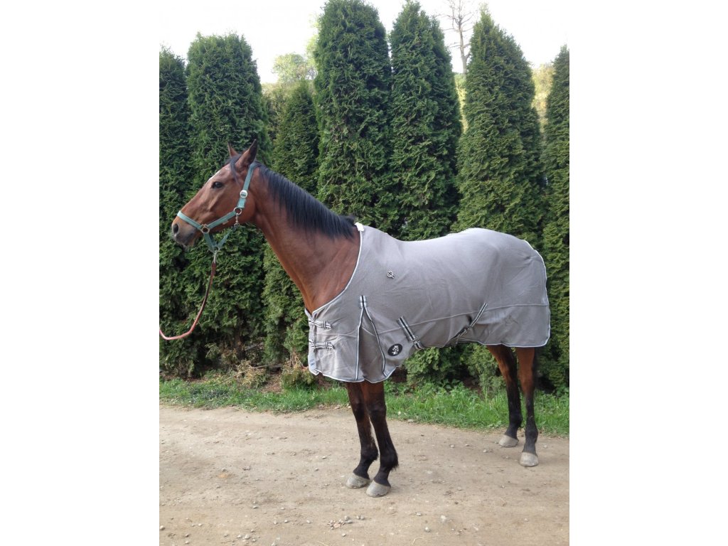 Antifly deka kombinuje dvě vrstvy ochranné síťoviny – vrchní s většími očky pro pohodlnou prodyšnost a spodní s menšími, která efektivně chrání proti malým bodavým hmyzům. Elegantní stříbrný povrch odráží sluneční paprsky. Deka je vybavena dvojitým zapínáním na hrudi, břišním laclem na T‑přezce, stabilizačními popruhy mezi zadními končetinami a ocasní šňůrou. Pod kohoutkem je měkký beránek, aby nedocházelo k otlakům. Materiál je snadno omyvatelný a lze jej prát na 30 °C.