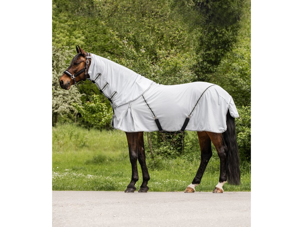 Součástí deky je i integrovaný krční díl, který zajišťuje celistvou ochranu krku. Deka má nastavitelné zapínání na hrudi, křížové popruhy pod břichem a elastické pásky pod zadní nohy pro bezpečné uchycení. Zadní klapka navíc chrání oblast ocasu před obtěžujícím hmyzem.