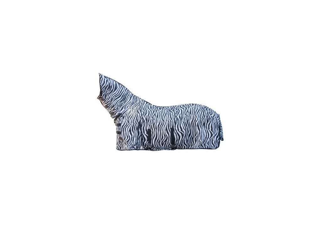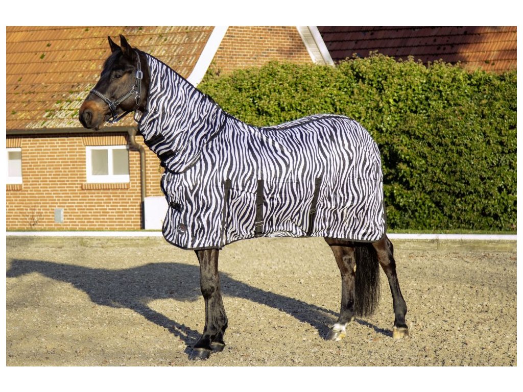 Síťovaná deka proti hmyzu Zebra HKM – s krkem nabízí kompletní ochranu koně od uší až po ocas. Vzor zebry není jen designový prvek – jeho vizuální efekt zmatkuje hmyz a znemožňuje mu bezpečně přistát, čímž se snižuje počet štípnutí i obtěžování.