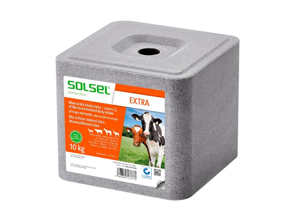 SOLSEL Extra je doplňkový krmný minerální produkt ve formě lizu, ideální pro pastviny i stáje. Obsahuje čistou sůl a přidané minerály, které zajišťují správný poměr sodíku, chloridů, hořčíku a stopových prvků. Lisovaný liz stimuluje přirozený příjem soli, podporuje vodní bilanci organismu, trávení, správnou funkci nervového a svalového systému. Vhodný pro koně při sportu, v období horkého počasí i sucha. Liz je pevný a mrazuvzdorný, vystačí na několik týdnů podle spotřeby stáda.