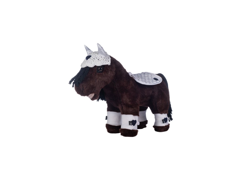 Soutěžní set pro plyšového koně Cuddle Pony od HKM Kids představuje zmenšené verze skutečných jezdeckých doplňků. V sadě najdete sedlovou dečku, čabraku na uši a čtyři bandáže, vše sladěné v bílé barvě s výraznou červenou nášivkou srdce. Výrobek je vhodný pro hru, péči a zdobení plyšových koní. Je vyroben ze 100% polyesteru a lze jej prát v pračce na 30 °C. Není vhodný pro děti do 3 let. Splňuje evropské bezpečnostní normy pro hračky.