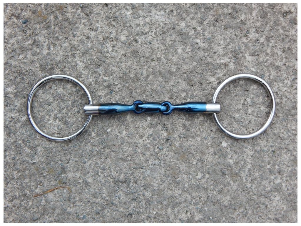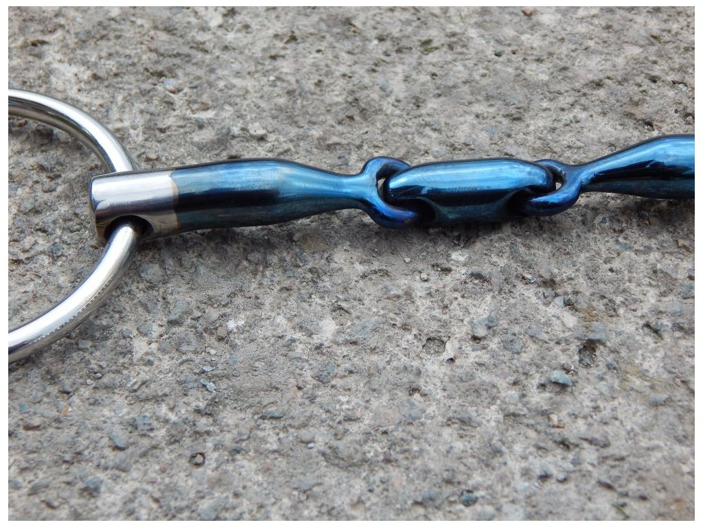 Toto dvakrát lomené stihlové udidlo je vyrobeno ze sladkého železa (Sweet Iron), které při kontaktu se slinami koně oxiduje, čímž vytváří hřejivý pocit a nasládlou chuť v hubě koně. Tato vlastnost podporuje slinění a napomáhá lepšímu přijetí udidla. Modré zbarvení udidla je charakteristické pro tento materiál a může se postupem času měnit v důsledku oxidace, což je běžný jev.
