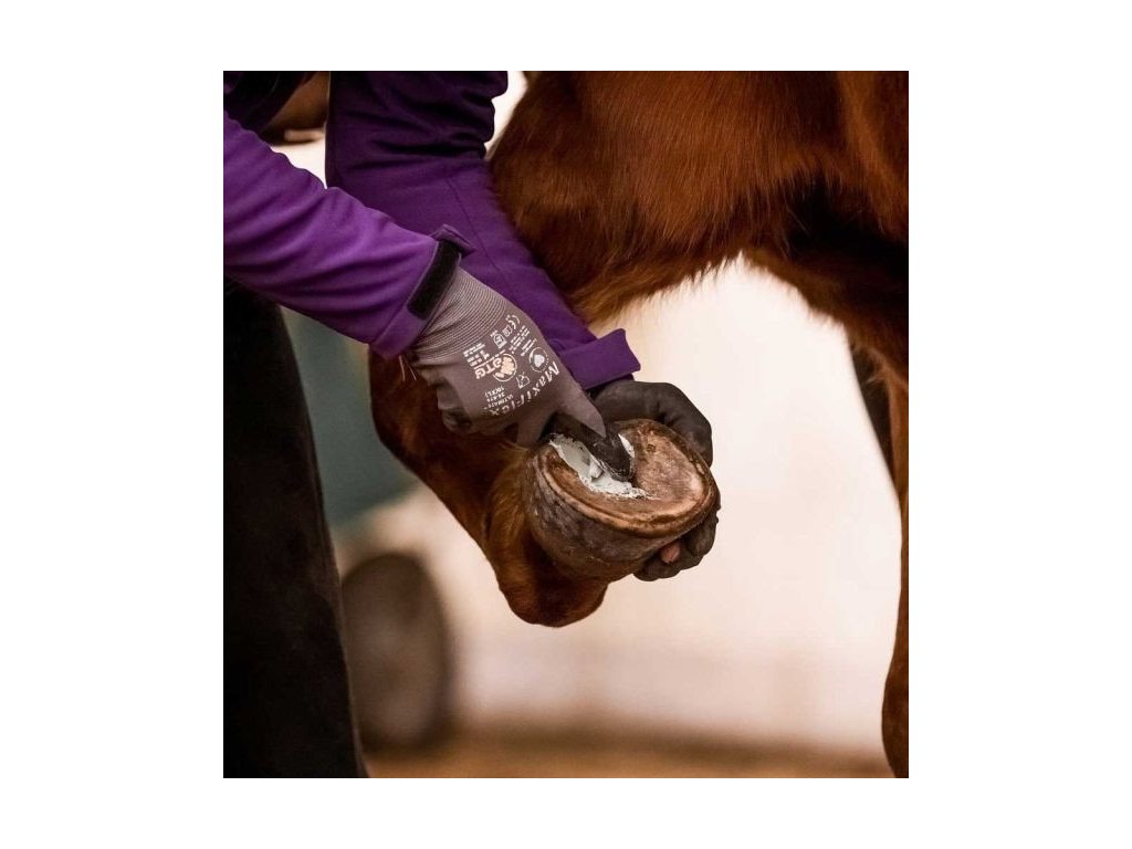 Očistěte a vykartáčujte kopyto (např. i drátěným kartáčem), naneste hojně na postižené oblasti – střelku, praskliny, bílé čáry, chodidlo. Nechte zaschnout – kůň může okamžitě položit kopyto. Nepotřebuje obvaz ani krytí. Podkovy, boty či podložky aplikujte až po zaschnutí.