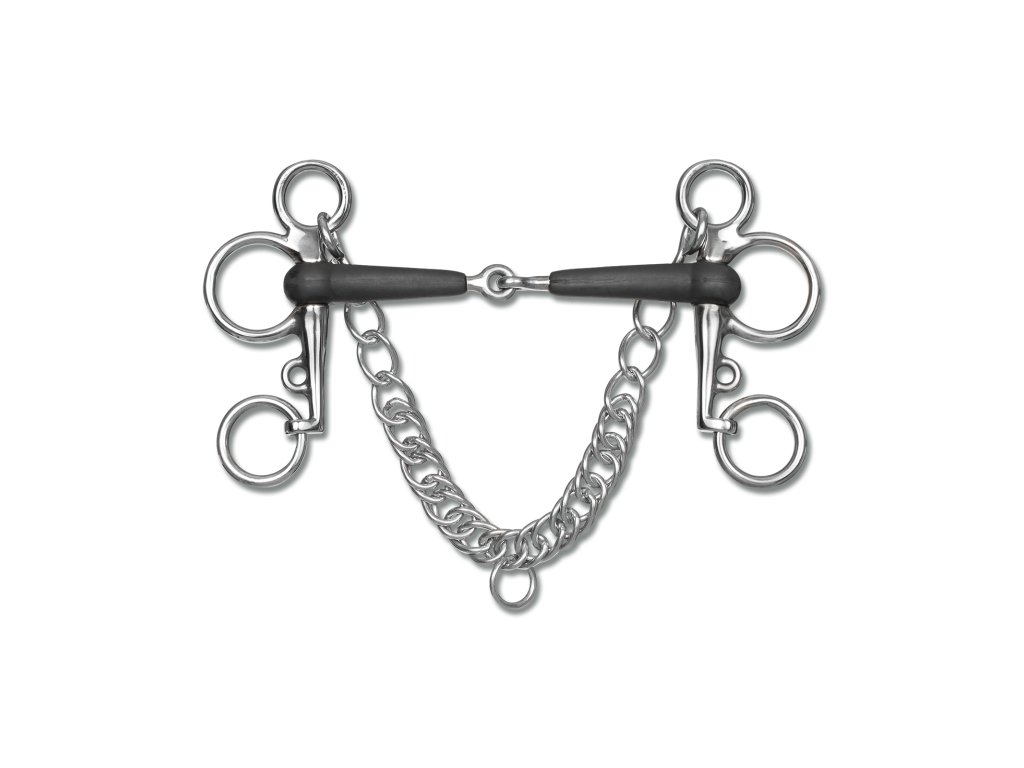 Pelham gumové udídlo od značky Waldhausen. Náustek je vyroben z kvalitního potravinářského polyuretanu, který je měkký, šetrný k hubě koně a zároveň velmi odolný. Udidlo je vybaveno pohyblivými rameny a dodáváno včetně bradového řetězu. Kombinuje účinek pákového a stihlového udidla, takže je vhodné pro zkušené jezdce, kteří potřebují větší kontrolu. Horní rameno měří 4 cm, spodní 5 cm, tloušťka náustku 15 mm.