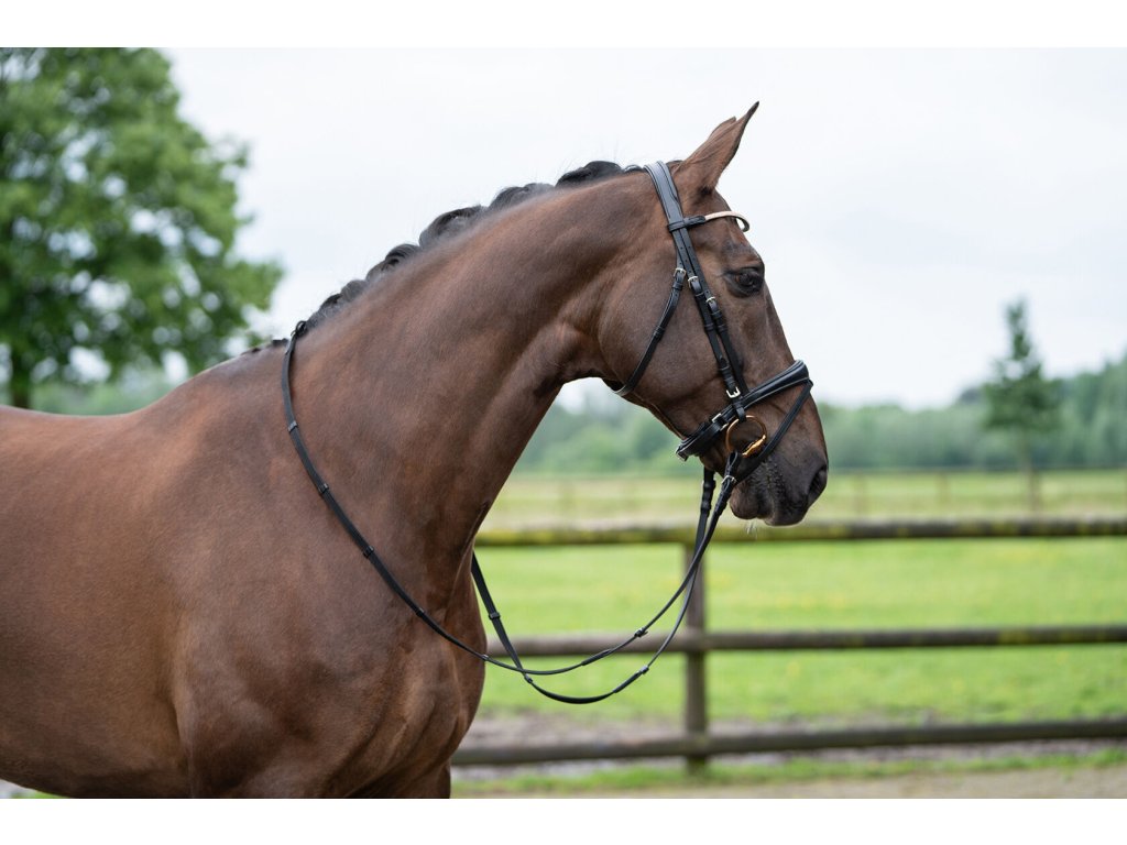 Uzdečka KOPENHAGEN od značky HKM je navržena tak, aby zajistila maximální komfort pro koně a zároveň reprezentativní vzhled. Vyrobena z kvalitní kůže s měkkým podložením, chrání proti otlakům a zajišťuje vysoký komfort i při delším tréninku nebo vyjížďce. Švédský nánosník s přezkou umožňuje přesné a šetrné nastavení, zatímco oboustranně nastavitelný podbradní řemínek zajišťuje optimální přizpůsobení. Uzdečka je doplněna otěžemi z tkaného materiálu s koženými dorazy, které poskytují pevný úchop a skvělou kontrolu. Čelenka s kontrastními ozdobnými kamínky je snadno odnímatelná díky praktickému zapínání na druk, což umožňuje jednoduchou údržbu i změnu stylu.