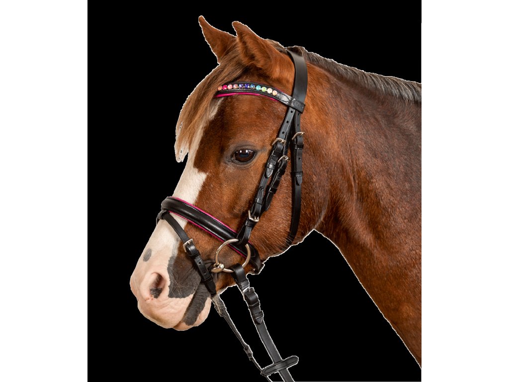 Uzdečka Pinky STAR zaujme výraznou čelenkou se třpytivými kamínky a jemnou růžovou podšívkou na nánosníku i čelence. Nabízí pohodlné nošení díky kvalitnímu zpracování a měkkému polstrování. Robustní kůže a kovové části z poniklovaného železa zajišťují dlouhou životnost. Součástí jsou 16 mm popruhové otěže. Ideální volba pro mladé jezdce nebo pro zpestření běžného tréninku.