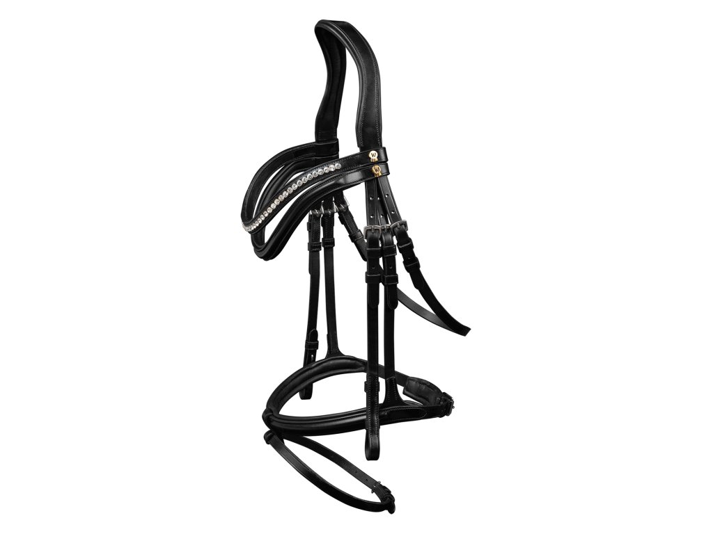Uzdečka Waldhausen S-Line Harmony kombinuje funkčnost a luxusní vzhled. Anatomicky tvarovaný nátylník zajišťuje pohodlí i při delší práci. Uzdečka je vybavena dvěma vyměnitelnými čelenkami – hladká kožená a krystalová. Nánosník i čelenka jsou měkce polstrované. Kování z nerezové oceli je odolné a elegantní. Otěže nejsou součástí balení.