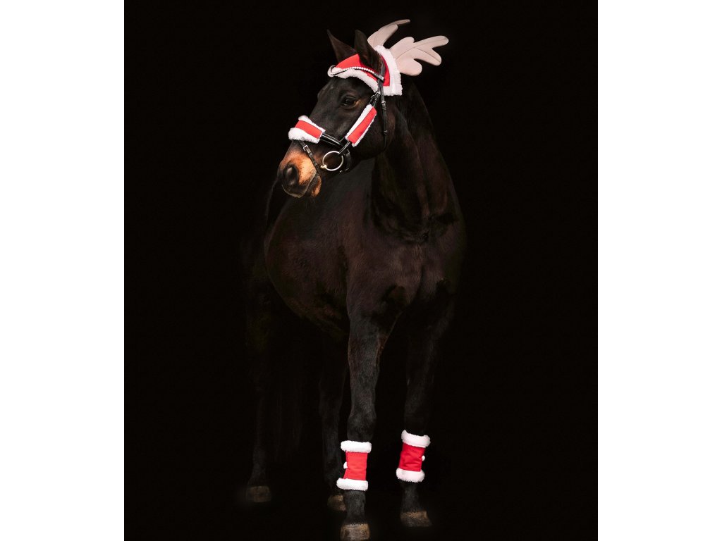 Vánoční set Waldhausen promění vašeho koně v originálního svátečního parťáka. Sada obsahuje sobí parohy s čelenkou, polstrování na nánosník a lícnice a 1 pár kamaší v červenobílé kombinaci. Díky univerzální velikosti a měkkému materiálu sedí většině koní. Ideální pro vánoční focení, tematické vyjížďky nebo zimní akce. Materiál je příjemný na dotek a snadno se udržuje.