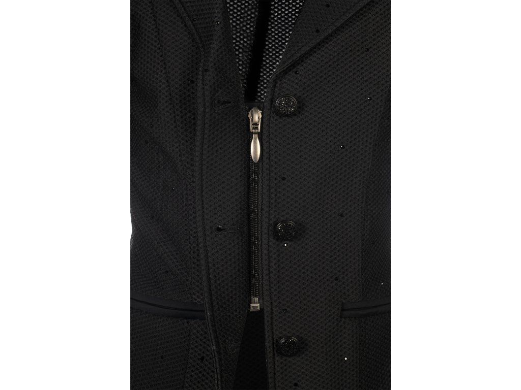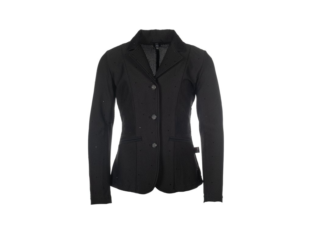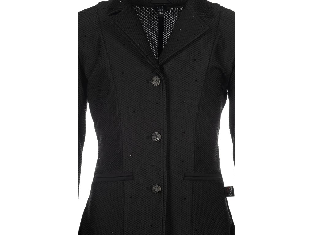 - The competition jacket Crystal Kids combines elegance and functionality so that even the little ones can make a big impression at competitions. The breathable material made of lightweight mesh ensures a comfortable fit even in warmer temperatures, while the tailored cut and integrated riding slits offer optimum freedom of movement. The concealed zip behind the button placket and the trim with fine rhinestones give the jacket an elegant touch. The material is crease-resistant and elasticated and therefore adapts perfectly to the shape of the body.